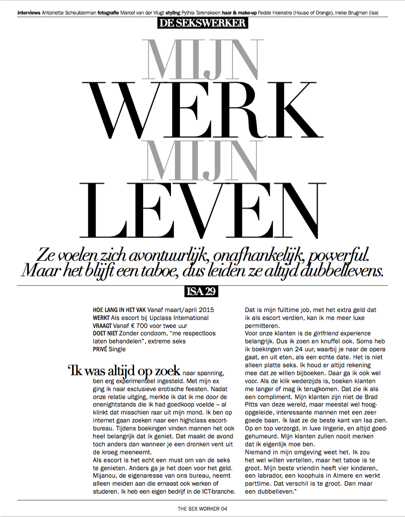 The Sex Worker edition #1: a unique magazine made for and by sex workers. A world first, created by institution P&G292, people from this industry and producers of famous Dutch magazine Linda. But above all a great initiative with loads of information for the workers and people involved in the relax industry, containing knowlegde- and experience sharing, tips&tricks and usefull contact details. We are proud to contribute to this initiative. In this first edition, Upclass lady Isa was interviewed about her work as high class escort.
